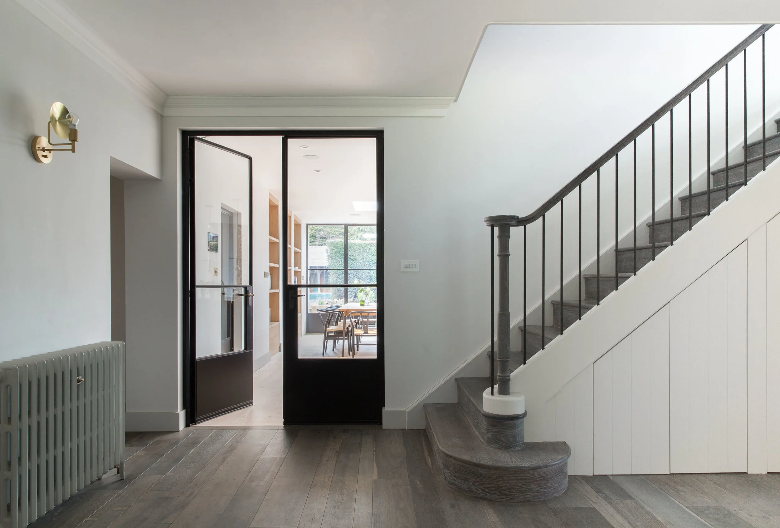 To celebrate the Arts and Crafts feel of the original house, we added details such as a new fireplace in the heart of the living room, traditional handmade shutters on the inside of the windows and reclaimed timber flooring throughout. All the furniture, lighting and rugs were specifically selected to be a mix of old and new, contrasting styles and references from traditional British classics to Scandinavian and more contemporary handcrafted pieces.